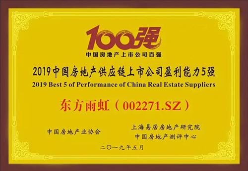 5月23日,由中國房地產(chǎn)業(yè)協(xié)會、上海易居房地產(chǎn)研究院中國房地產(chǎn)測評中心聯(lián)合開展的“2019中國房地產(chǎn)上市公司測評成果發(fā)布會”在香港召開。東方雨虹憑借強大的綜合實力,榮獲“2019中國房地產(chǎn)供應(yīng)鏈上市公司盈利能力五強”。
