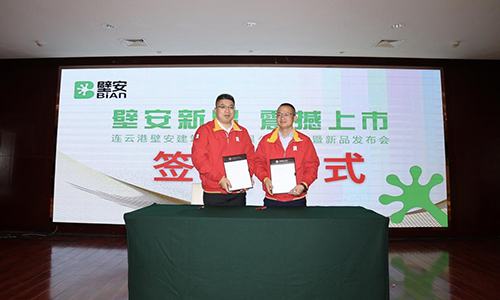 民建壁安粘合劑事業部總經理陳明先生代表壁安品牌與連云港壁安建筑材料有限公司董事長汪奇先生進行授權簽約。