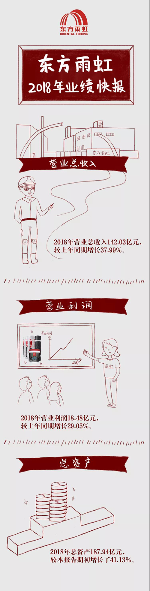 2月25日,東方雨虹公告2018年度業(yè)績快報。 報告期內(nèi),公司實現(xiàn)營業(yè)總收入142.03億元,較上年同期增長37.99%,主要系隨著公司品牌影響力不斷提升,產(chǎn)品銷量同比增長,材料銷售業(yè)務(wù)和施工服務(wù)業(yè)務(wù)規(guī)模均有所增長所致;營業(yè)利潤18.48億元,較上年同期增長29.05%;利潤總額18.52億元,較上年同期增長28.91%;歸屬于上市公司股東的凈利潤15.18億元,較上年同期增長22.54%;基本每股收益1.01元,較上年同期增長21.69%,主要原因是報告期公司營業(yè)狀況整體向好,主要產(chǎn)品的銷售收入、施工收入繼續(xù)增加,毛利潤逐步提高所致。 報告期公司財務(wù)狀況良好,截至2018年12月31日,公司總資產(chǎn)187.94億元,較本報告期初增長了41.13%,主要是公司經(jīng)營規(guī)模擴大所致。