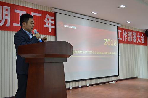 陸殿富先生作重要講話,他首先肯定了昆明生產基地在過去一年的變化與成長,隨后他要求生產基地全體人員要加強學習,夯實各崗位的本領,2018年昆明生產基地肩負重任,要從"產品質量、成本管控、創新與成果"等方面進行全面部署,希望生產基地全體員工腳踏實地,努力進取,在2018年實現全面超越自我。