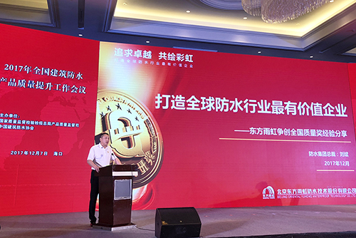 12月7日,“全國建筑防水行業質量提升工作大會”暨2017年建筑防水行業年會在??谡匍_。住建部、國家質檢總局,質量監督司、執法督查司、工信部原材料司及各省、自治區、直轄市質量監督局等有關人員出席本次會議。東方雨虹防水集團總裁劉斌受邀出席,并發表題為“打造最有價值企業”的演講。