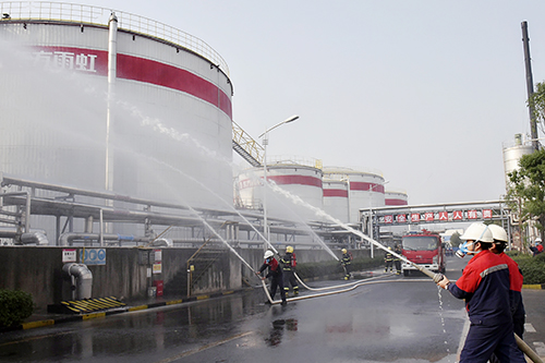 演習現場,隨著瀝青罐區的濃煙的升起,瀝青車間中控室立即啟動火災撲救及應急疏散預案,滅火行動組、疏散引導組、防護救護組及通訊保障組迅速就位開展火情控制、人員疏離和現場警戒等工作,云溪消防大隊官兵接到報警電話后火速抵達現場進行滅火救援。整場消防演習場面真實,開展滅火救援井然有序。