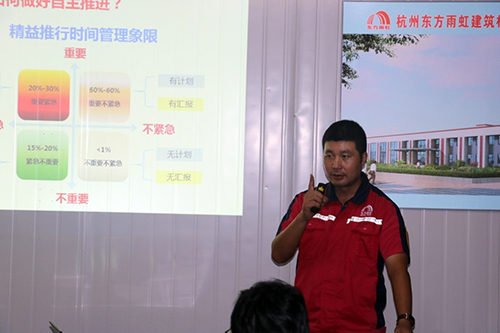 9月1日至9月27日,東方雨虹杭州建德生產(chǎn)基地組織一線生產(chǎn)員工進(jìn)行開(kāi)工前集訓(xùn)。 培訓(xùn)學(xué)習(xí)的主要內(nèi)容有精益生產(chǎn)管理、防水卷材產(chǎn)品知識(shí)介紹、卷材生產(chǎn)過(guò)程控制、卷材生產(chǎn)設(shè)備現(xiàn)場(chǎng)管理及安全生產(chǎn)管理四大部分。此外還有防水卷材檢測(cè)知識(shí)相關(guān)培訓(xùn)和車間班組建設(shè)與管理等專項(xiàng)課程。