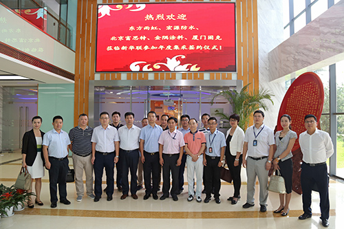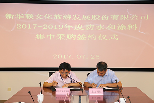 7月25日,新華聯(lián)文化旅游發(fā)展股份有限公司2017-2019年度防水和涂料集中采購簽約儀式在北京臺湖新華聯(lián)總部召開,包括東方雨虹在內(nèi)的五家涂料和防水供應(yīng)商代表受邀參加。新華聯(lián)集采中心總監(jiān)彭建奇主持儀式,東方雨虹集團(tuán)副總裁張洪濤參加簽約儀式并發(fā)言。