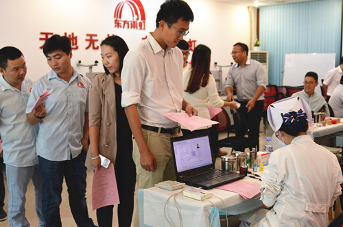本次活動中, 45名報名獻血的東方雨虹員工帶著溫暖的笑容積極配合廣州市中心血站的工作人員安排,認真填寫獻血登記,在工作人員的指導下口服葡萄糖水預防低血糖反應,以確保獻血安全。整個獻血過程輕松有序,氣氛活躍,在雨虹人的無私奉獻下,總采血量達12600cc。