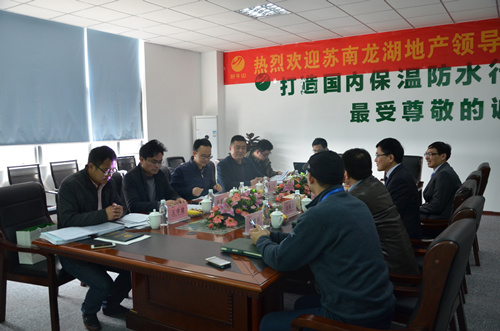 2016年3月16日,龍湖集團蘇南公司工程部總監胡宏偉、招標中心負責人王德倫、工程管理中心負責人黃衛軍、工程中心土建經理王學建、研發經理孔蒙一行五人參觀江蘇臥牛山公司,對臥牛山公司的建筑保溫技術水平及在施工項目進行參觀考察。江蘇臥牛山公司董事長、總經理劉志榮、總工程師花海東、副總經理劉和軍、副總經理張建新、副總工程師成時亮負責接待并陪同考察。 上午10點,蘇南龍湖地產相關領導一行參觀公司之后,前往技術中心展廳對公司的技術水平做更深一步的了解。技術展廳的考察包括參觀保溫主材樣板、施工樣板、外墻涂料樣板以及建筑保溫系統展示墻等,臥牛山公司總工程師花海東向龍湖地產相關領導全面介紹了建筑保溫多種系統解決方案。