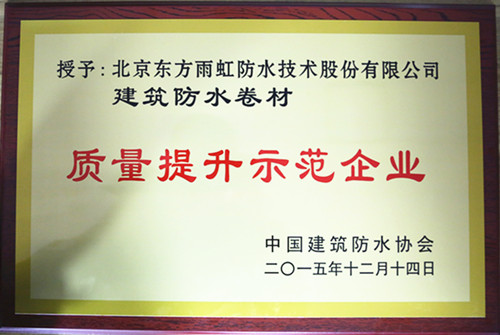 12月14日,中國建筑防水協(xié)會第七次會員大會暨“全國建筑防水行業(yè)質(zhì)量提升大會”在京舉行。北京東方雨虹防水技術(shù)股份有限公司在會上被評為“質(zhì)量提升示范企業(yè)”。 2015年9月,在國家質(zhì)檢總局的指導(dǎo)下,由中國建筑防水協(xié)會聯(lián)合地方防水社團(tuán)組織及骨干企業(yè)開展的建筑防水行業(yè)“質(zhì)量提升萬里行”活動啟動,東方雨虹作為“建筑防水行業(yè)質(zhì)量萬里行”典型單位,在會上被授予“質(zhì)量提升示范企業(yè)”稱號。