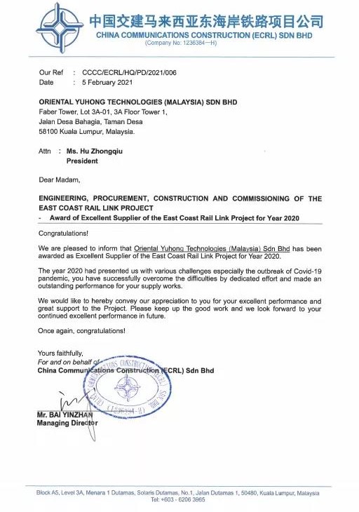 日前,東方雨虹(ORIENTAL YUHONG)喜獲2020年中國(guó)交建馬來(lái)西亞?wèn)|海岸鐵路項(xiàng)目總經(jīng)理部年度優(yōu)秀供應(yīng)商稱號(hào)。