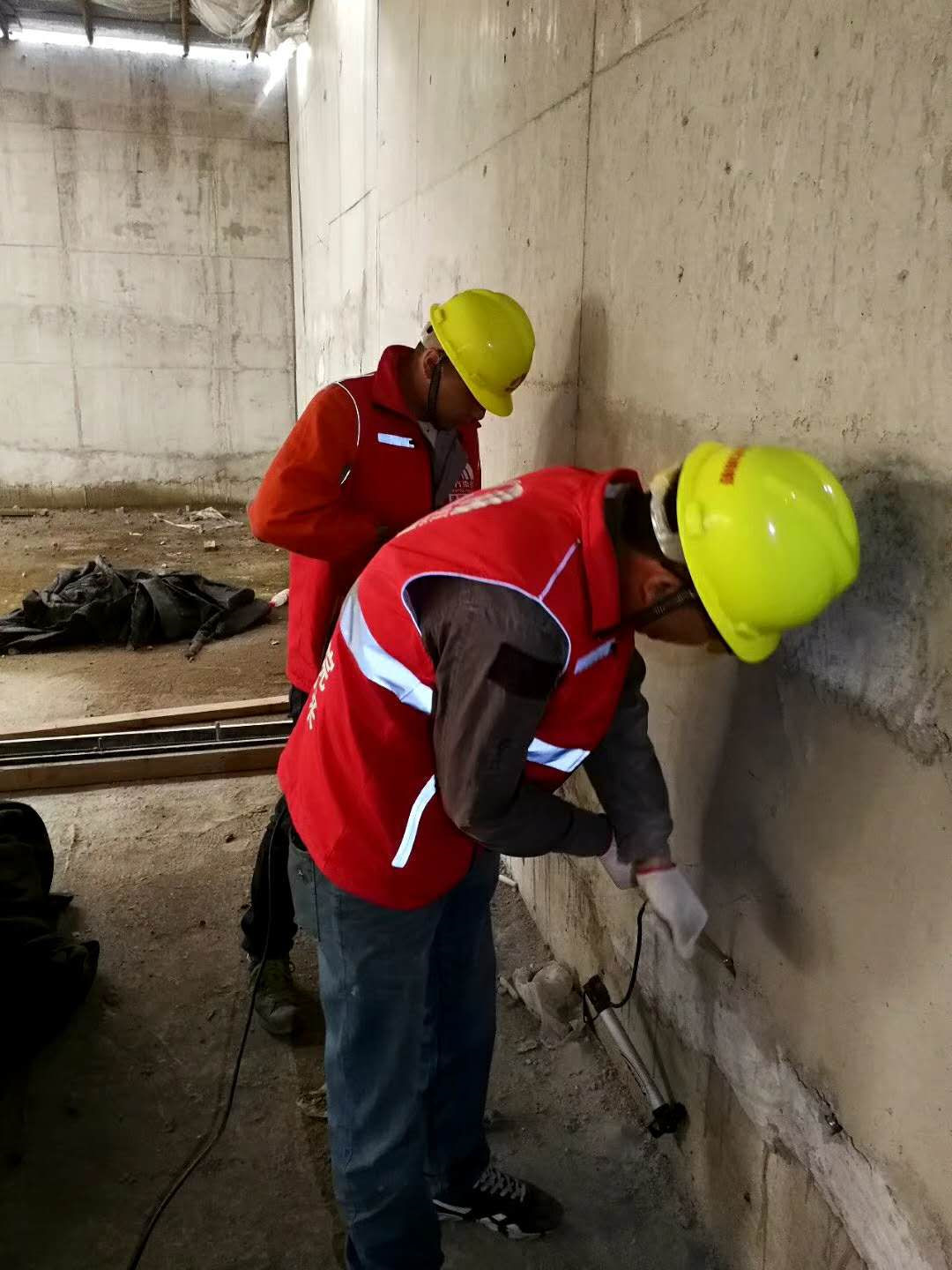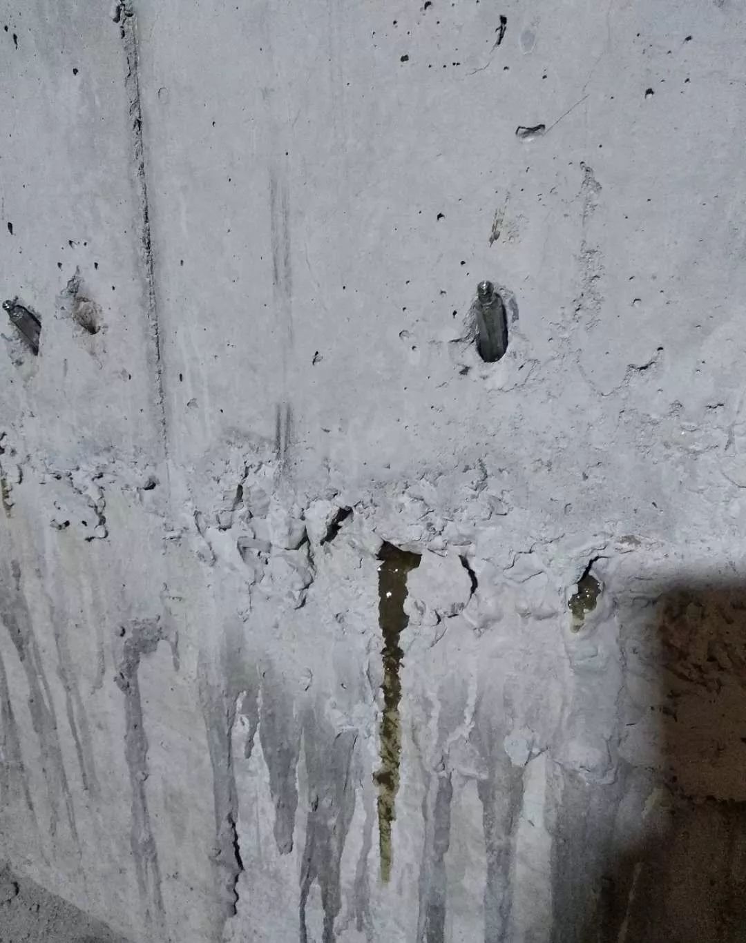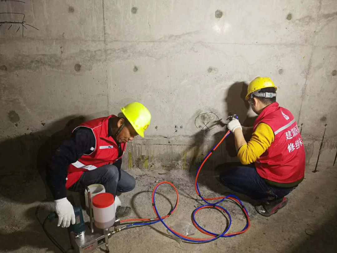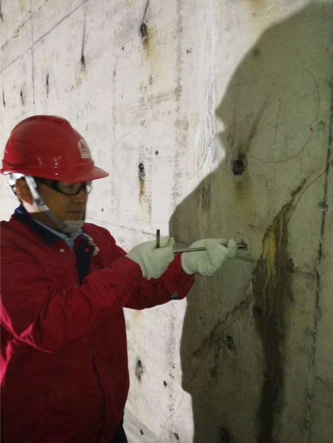 灌漿針頭需要取出,用堵漏2#進(jìn)行孔洞封堵。灌漿針頭為鋁制品。如果殘留在墻體內(nèi)部,由于其和混凝土的熱脹冷縮系數(shù)不同,將來容易在針頭針頭周邊因為溫度應(yīng)力形成裂縫。