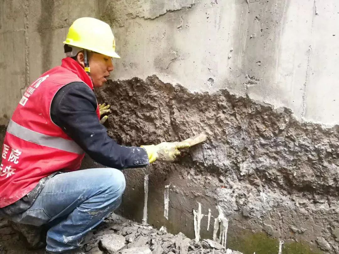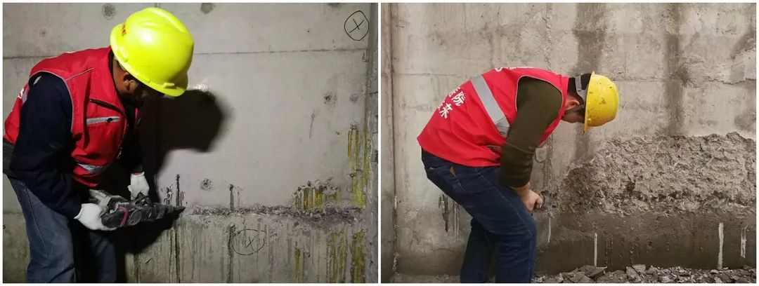 采用凝結(jié)時間較長的堵漏2#進(jìn)行封堵作業(yè)。避免因為凝結(jié)速度過快,造成裂縫的產(chǎn)生。清除部位用抗?jié)B1#做整體背防,恢復(fù)混凝土的設(shè)計強(qiáng)度。