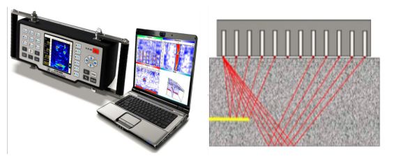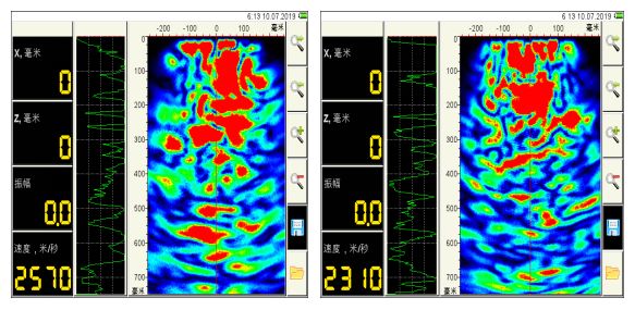 為尋找造成地下防水工程滲漏的原因,以更好地控制防水工程質量,雨虹修繕引進超聲波斷面成像儀,可用于混凝土結構中的外部侵入物、缺陷、裂縫以及管道及蜂窩等缺陷的無損檢測。如果混凝土內部的缺陷足夠大,激發(fā)的超聲波會被該缺陷提前發(fā)反射,因為反射線路徑更短,由缺陷反射的信號會早于混凝土底面反射的信號到達接收端。信號處理軟件依據(jù)每排換能器接收到的反射脈沖的到達時間,來推斷混凝土內部缺陷的位置,最大可探查1.8m。