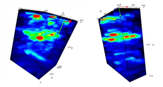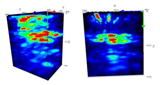 三維立體掃描,側墻部位其內部孔隙率非常多,多集中在表層以及200mm到300mm之間區(qū)域,且存在貫穿性裂縫。