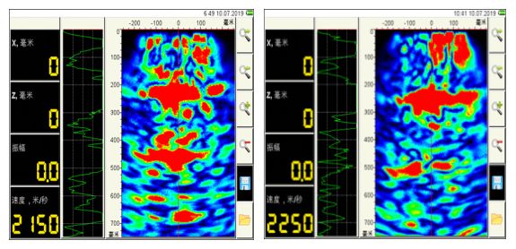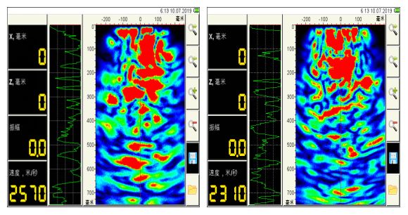 單點掃描,大多數(shù)點從表層至300mm處均有連續(xù)性缺陷。內部孔隙率也非常高,目前存在滲水情況。對照分析,內部存在連續(xù)性的缺陷,符合現(xiàn)場滲漏水;